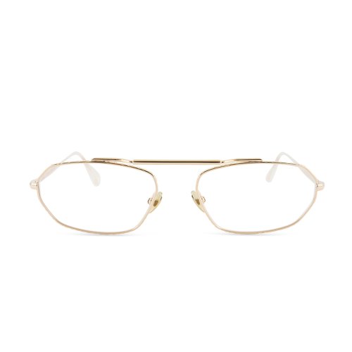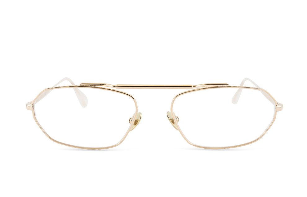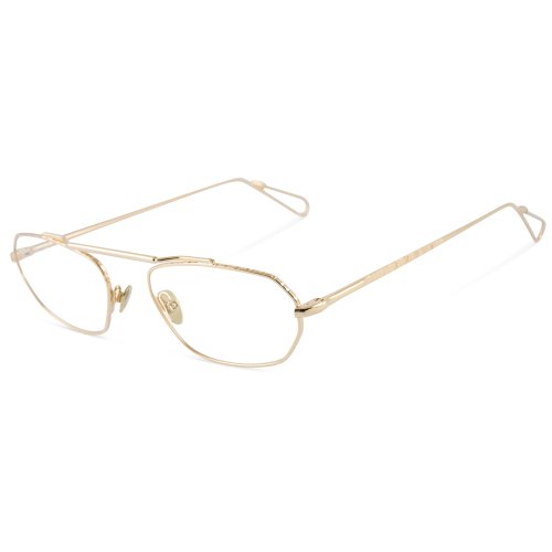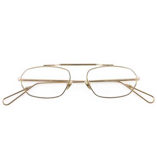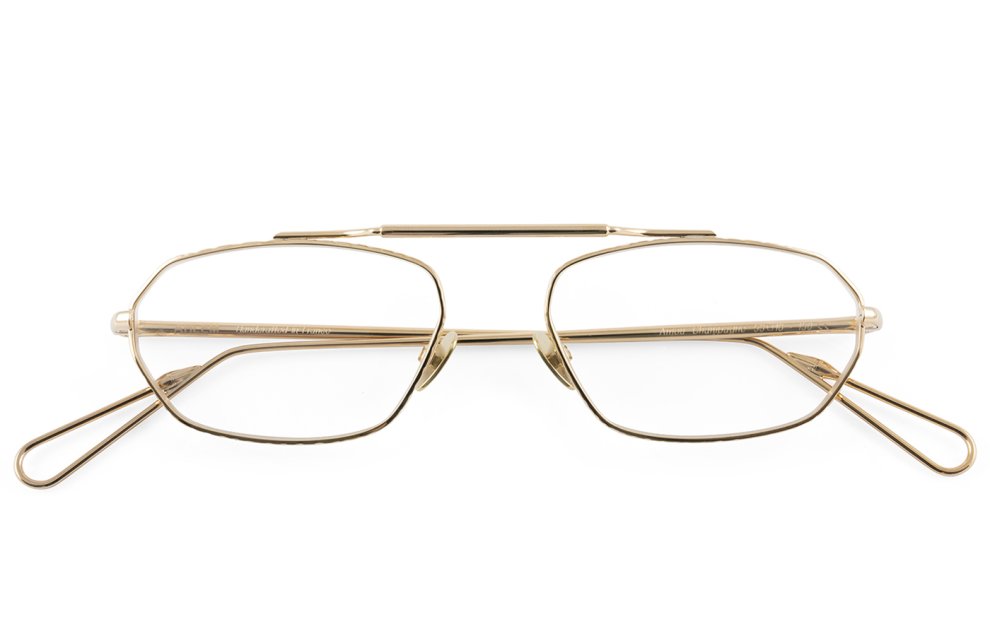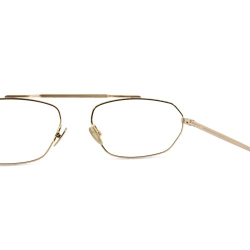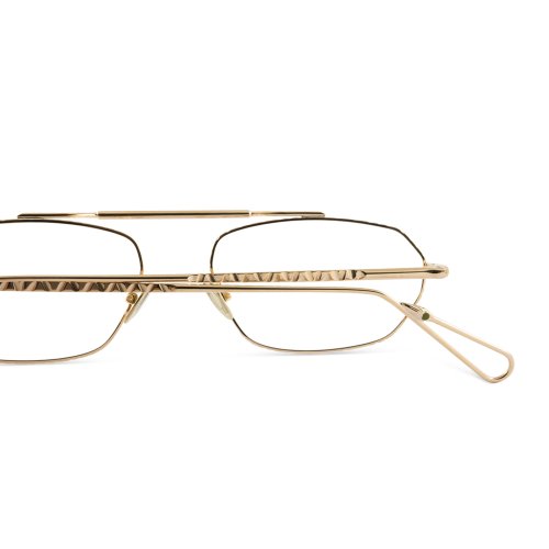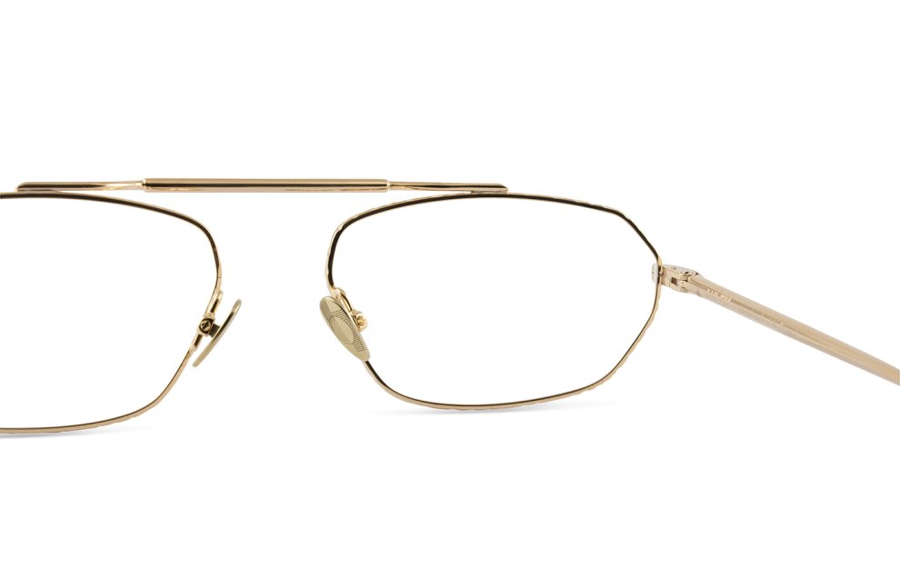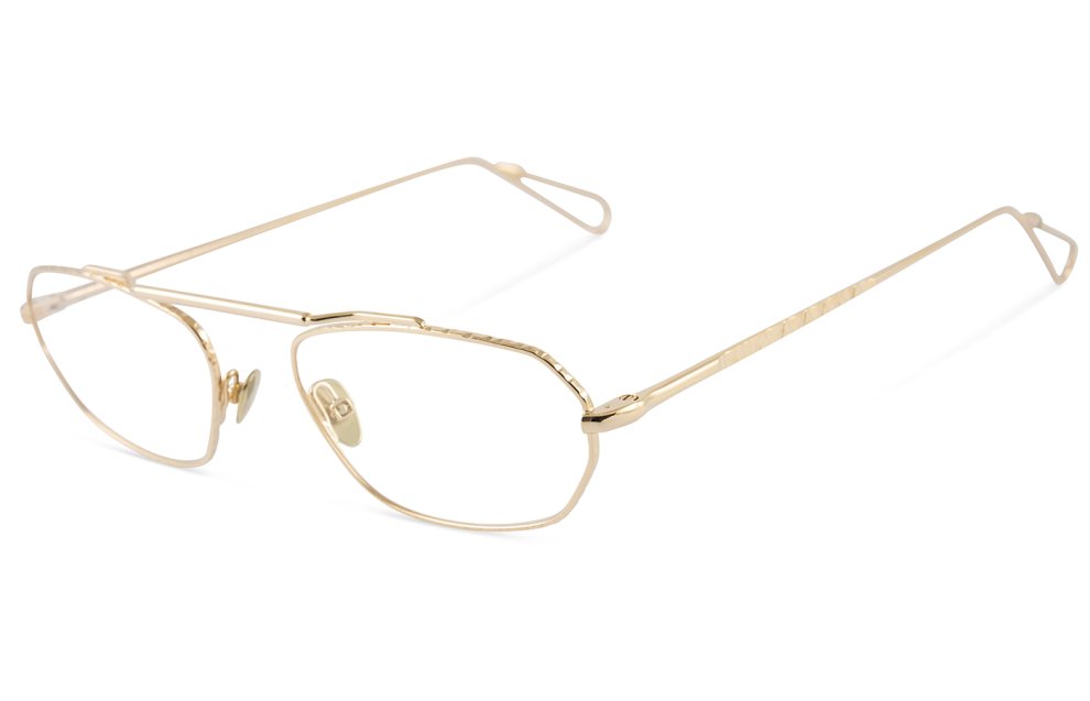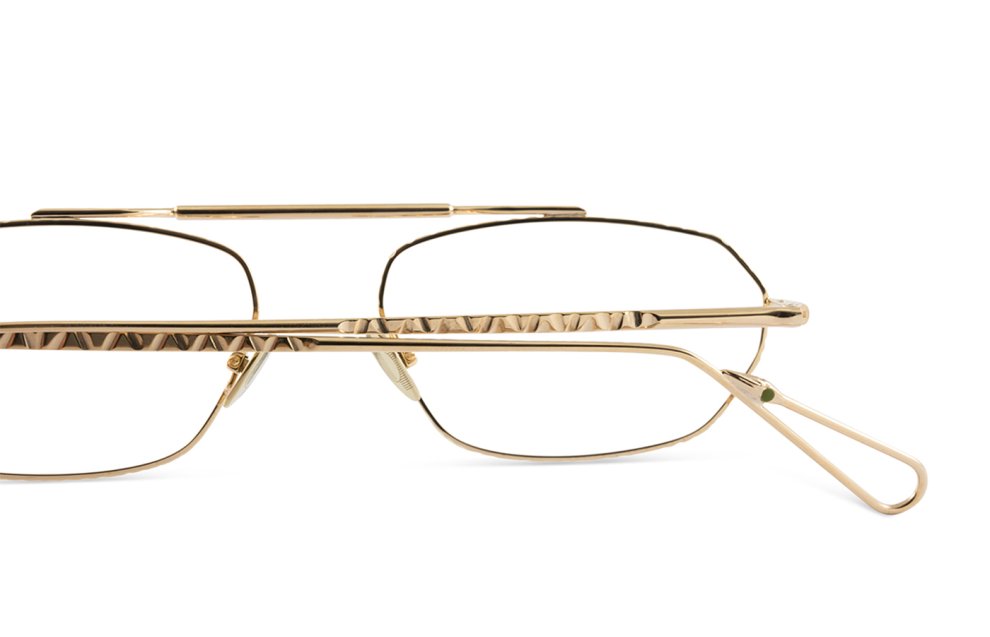 Una montatura unisex realizzata in acciaio placcato in palladio e oro 22k con naselli in titanio inciso con filigrana.
