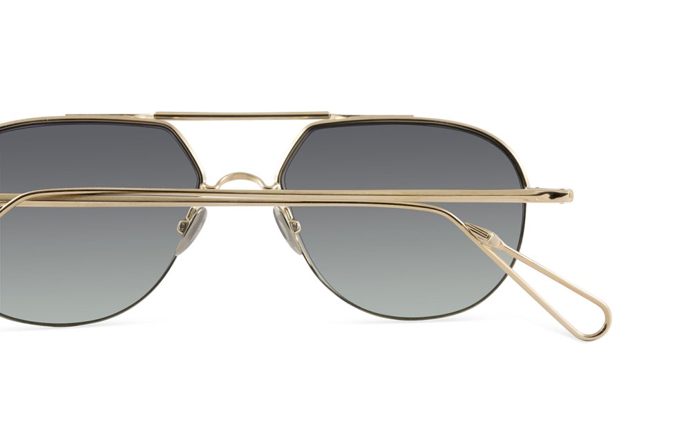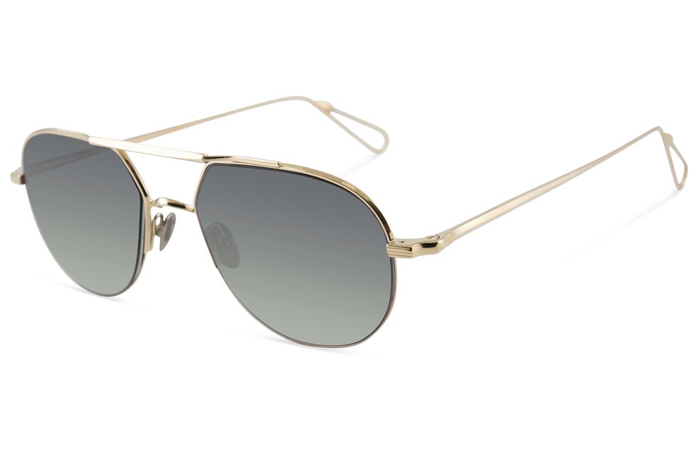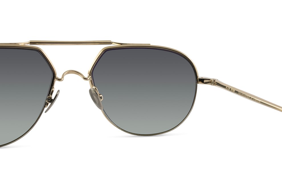 Una montatura unisex realizzata in acciaio placcato in palladio e oro 22 kt con naselli in titanio inciso.
