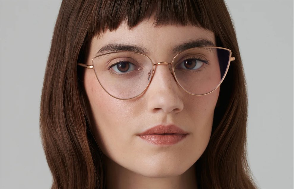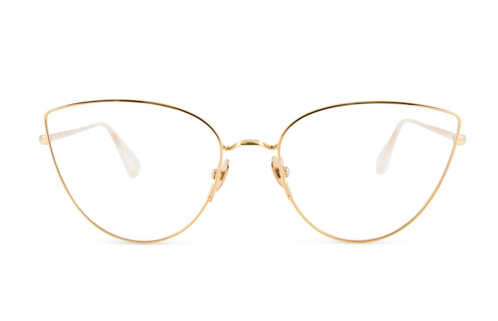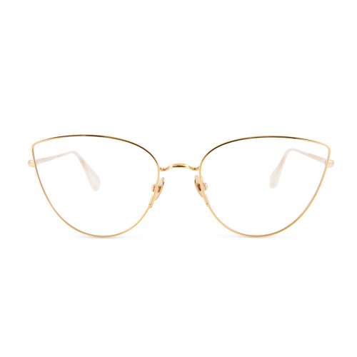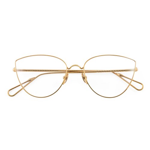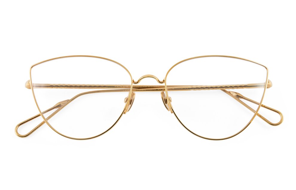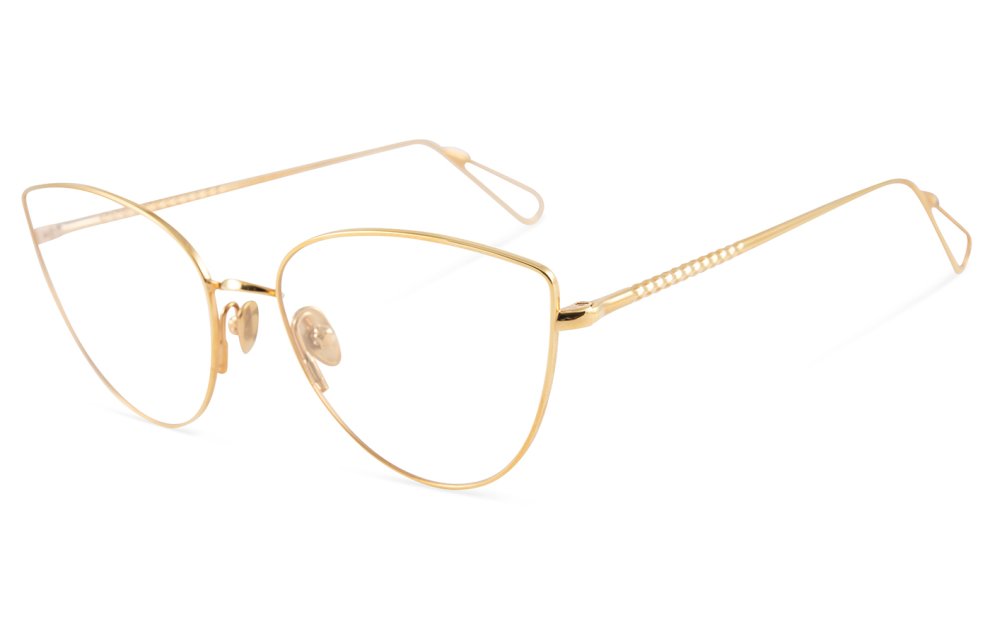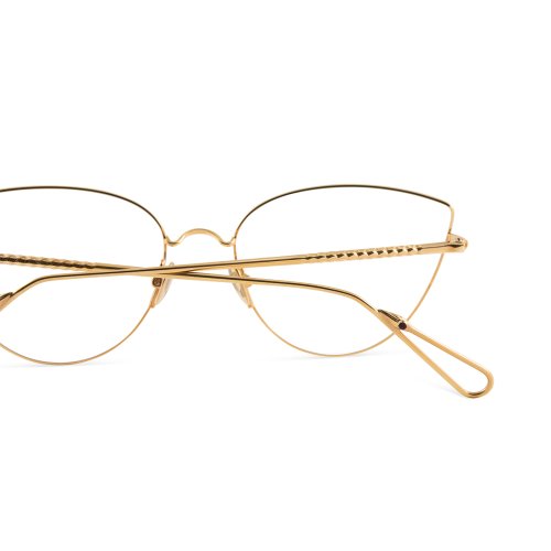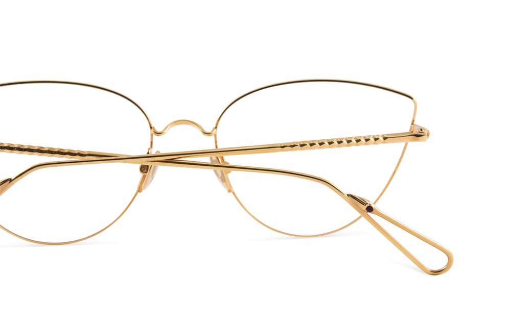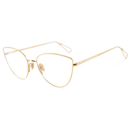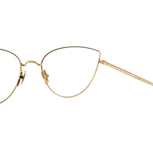 Una montatura femminile realizzata in acciaio placcato in palladio e oro 22k con naselli in titanio inciso con filigrana.