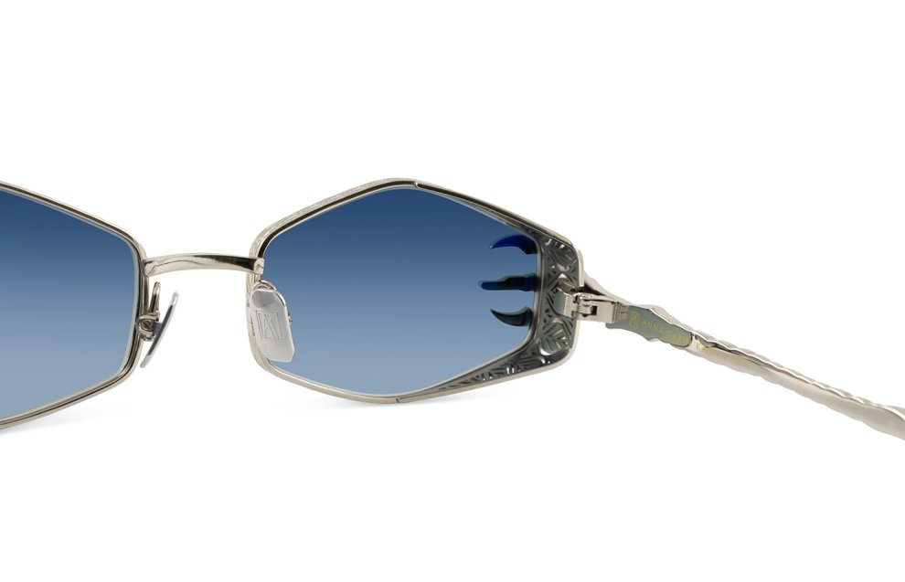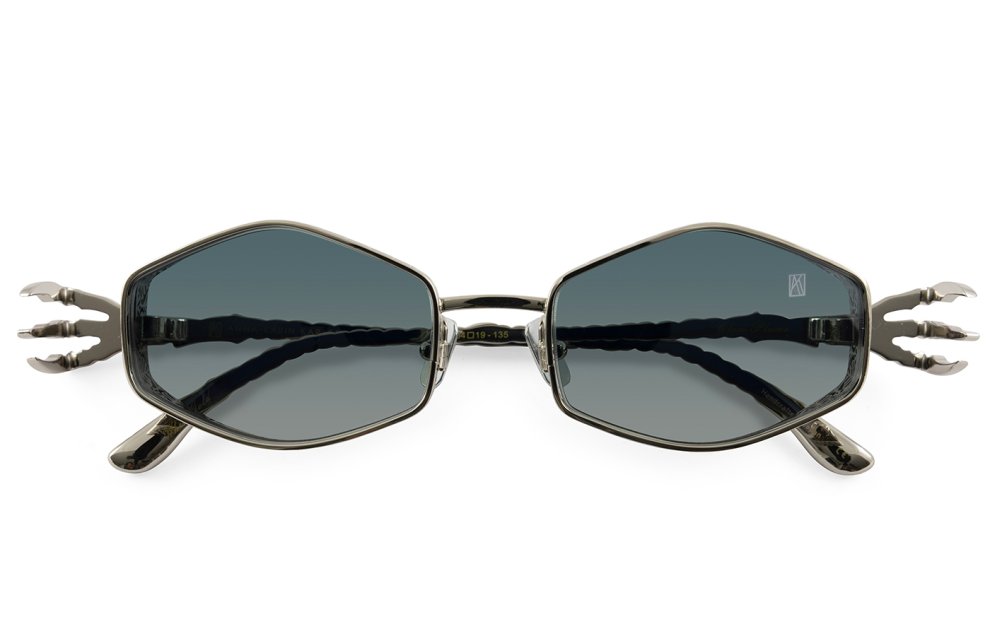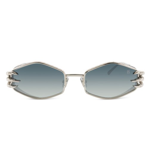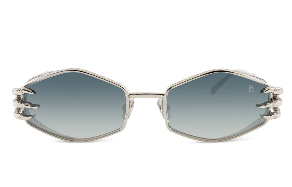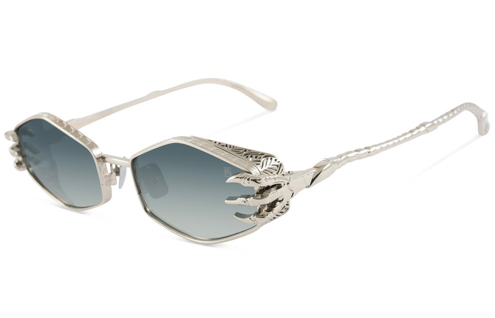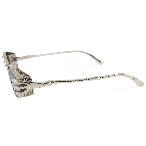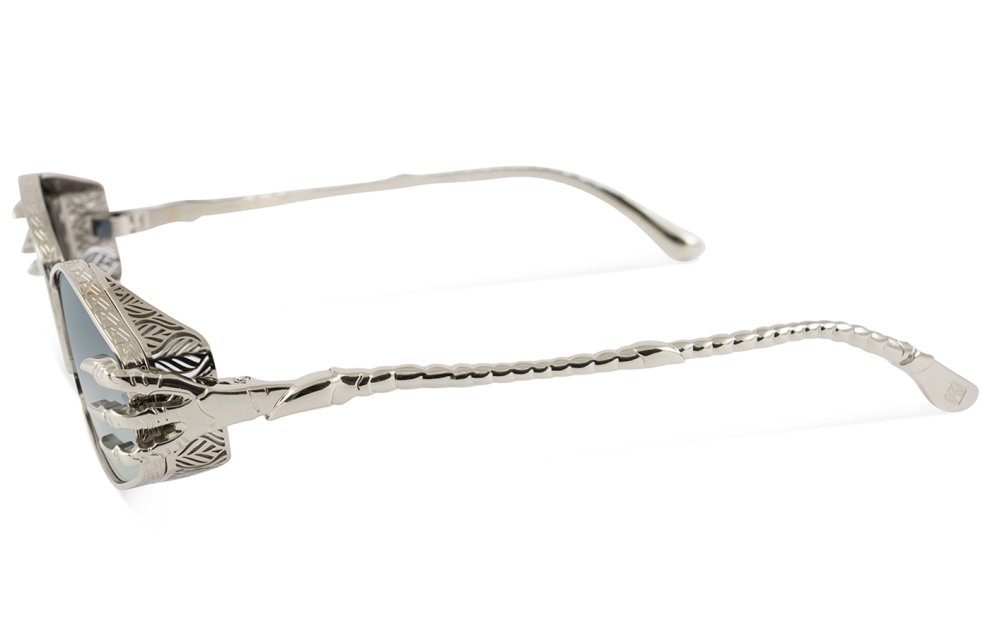 A unisex frame made of titanium plated in white gold with claw-shaped temples.