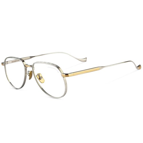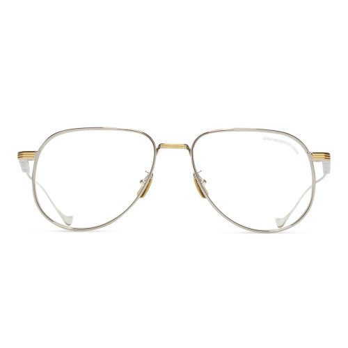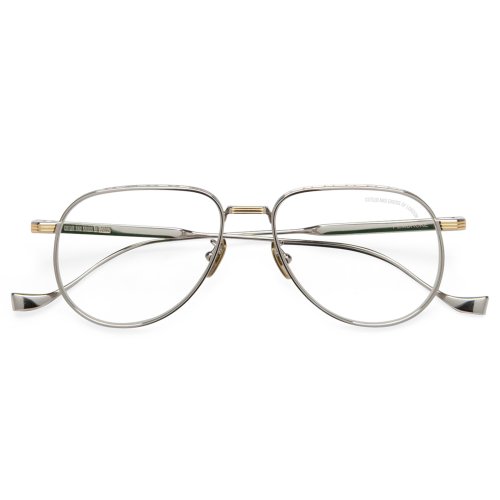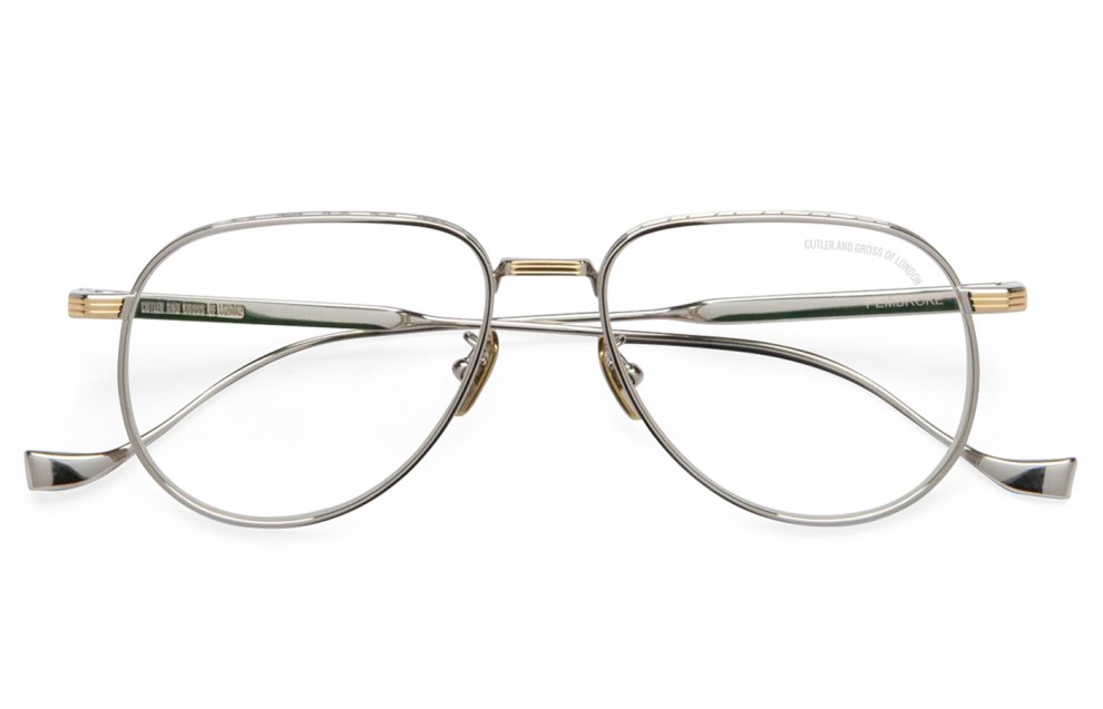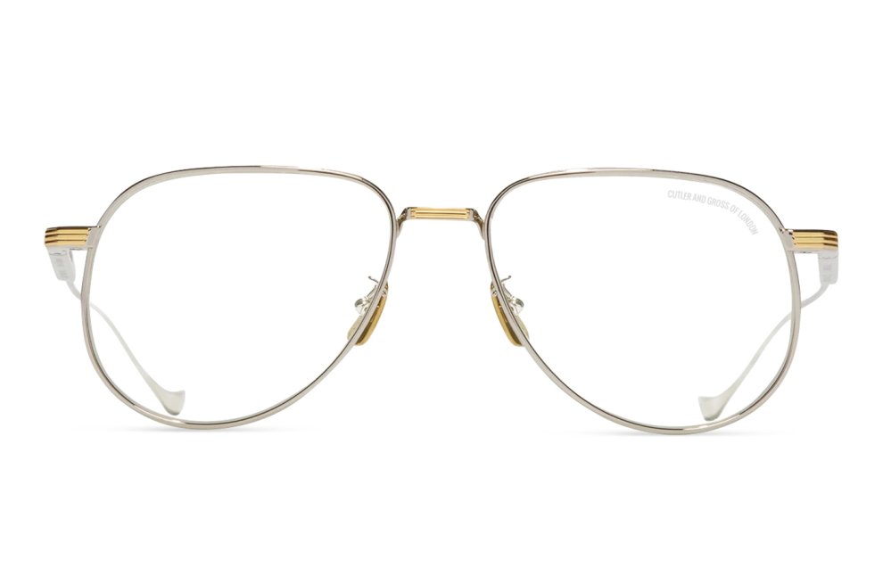 The Cutler and Gross Pembroke 1429 in silver / gold color is unisex eyewear made of titanium hand made in Japan with clear lenses suitable for mounting prescription lenses.