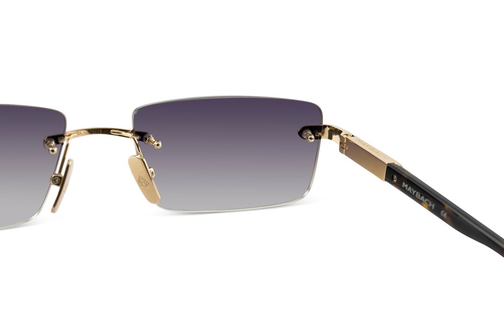 Un' occhiale senza montatura unisex realizzato in prezioso titanio puro placcato in platino con aste in acetato italiano lucidate a mano e rifinite con logo inciso Maybach.