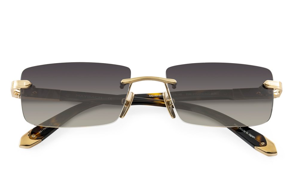 Il Maybach - The Symphony sun I dal colore mellow gold / tortoise è un occhiale realizzato artigianalmente in Germania con lenti dal colore grigio sfumato 100% anti UV con antiriflesso interno e logo inciso.